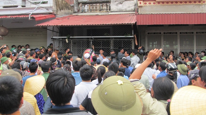 | Nhiều người dân quá khích tụ tập trước cổng nhà bác sĩ Lê Văn Định (giữa ảnh), phá cửa cổng, đập phá làm hỏng một số đồ dùng chiều 19/10. |