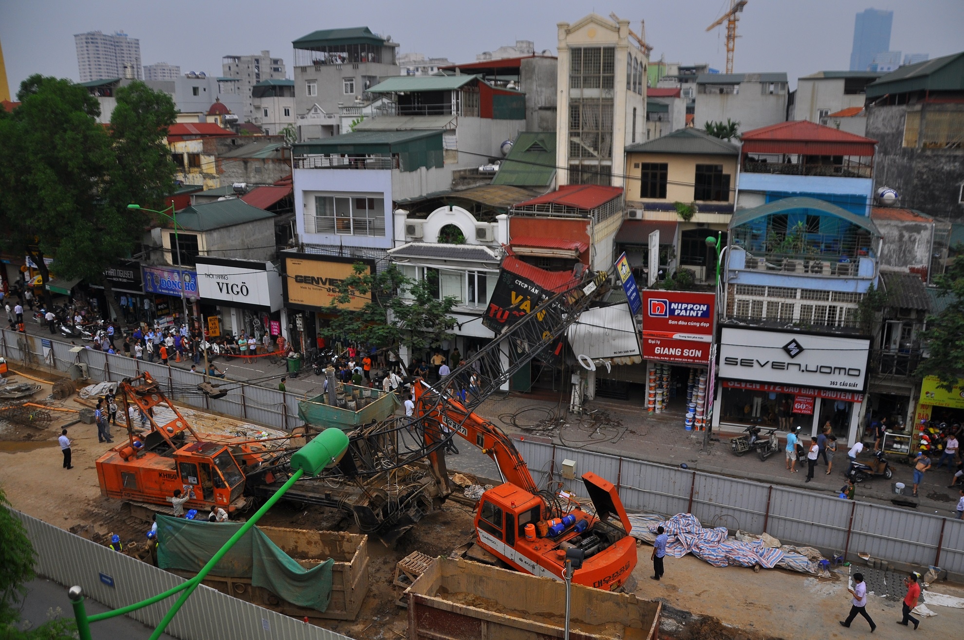 | Toàn cảnh hiện trường cần cẩu bị đổ sập. Ảnh: Hoàn Nguyễn. |