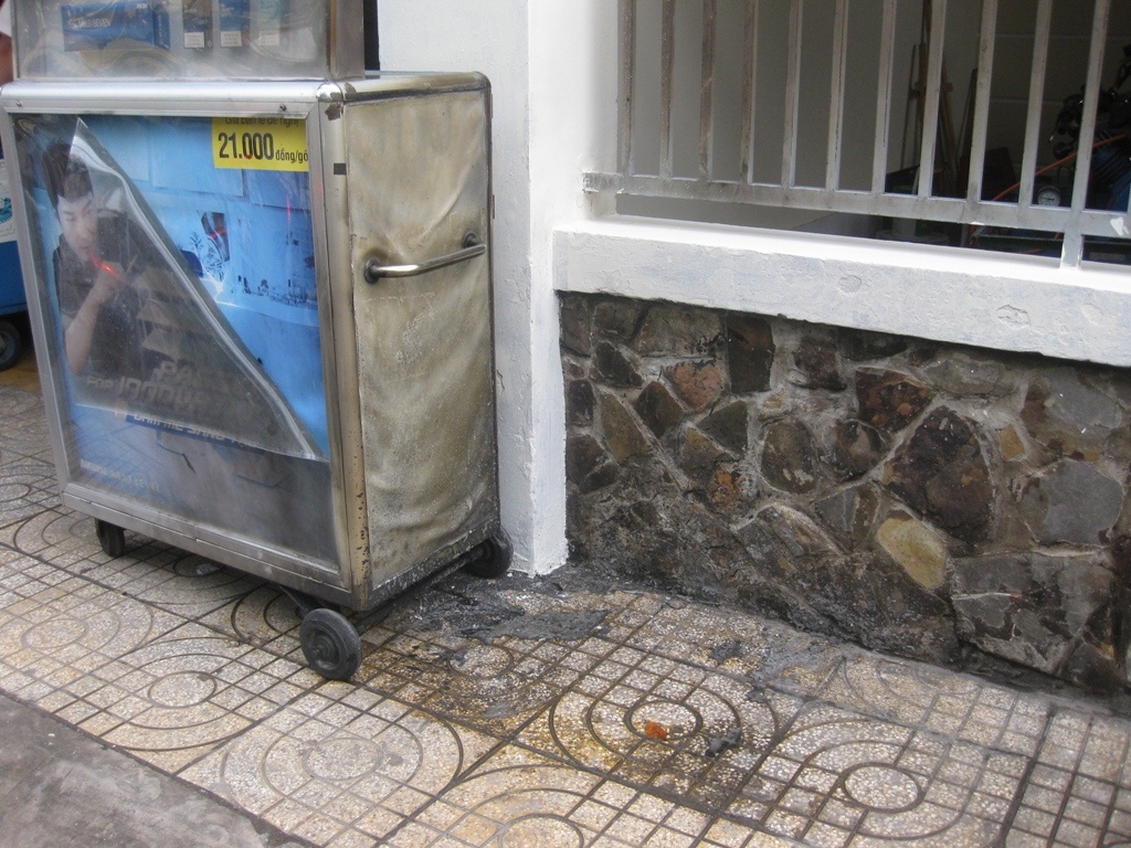| Góc đường nơi anh Đông đổ xăng tự thiêu làm một tủ thuốc lá của người dân bên cạnh bị cháy xém. |