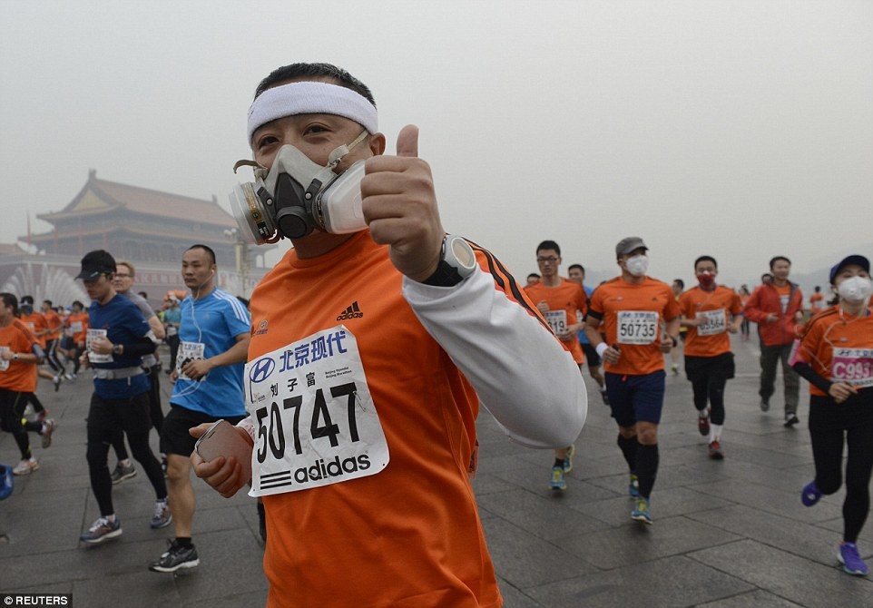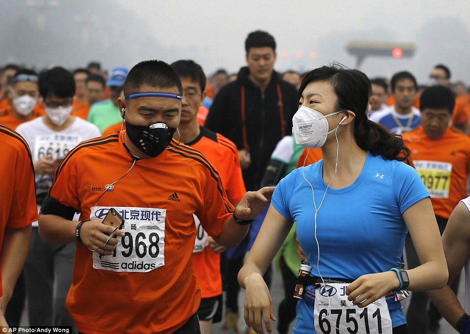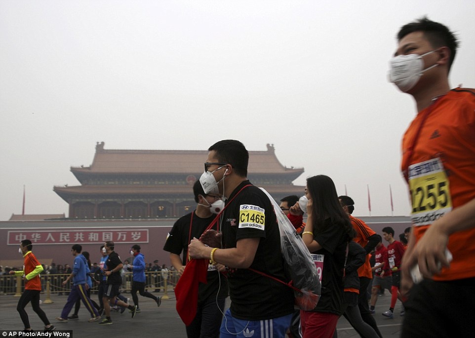 Hầu hết vận động viên vừa chạy vừa đeo mặt nạ phòng độc để không hít phải không khí bụi bẩn do bầu không khí ô nhiễm nặng nề tại thủ đô Bắc Kinh, Trung Quốc. Ảnh: AP