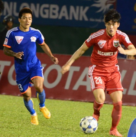 | Tiền đạo Quang Hải (áo xanh) đang có phong độ rất tốt trong màu áo Quảng Ninh. Ảnh: Nguyễn Quang |