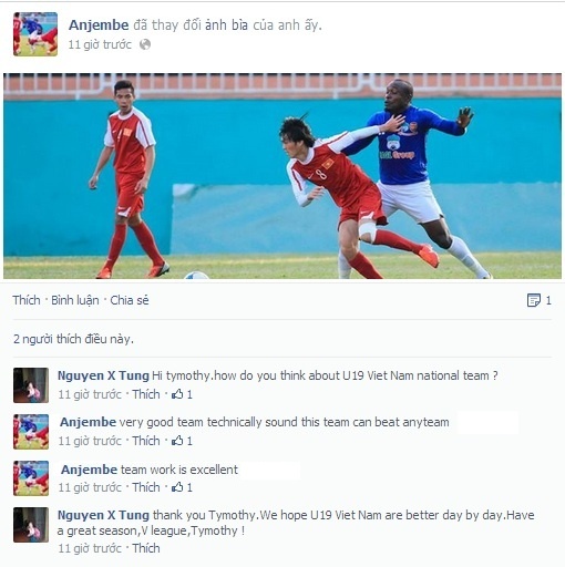 Timothy Anjembe là một trong những bản hợp đồng ngoại binh mới nhất được tăng cường cho V.League 2014 của CLB HAGL. Trong trận đấu giao hữu rà soát đội hình giữa đội 1 HAGL và U19 Việt Nam diễn ra chiều qua trên SVĐ Pleiku, tiền đạo mang biệt danh "bò mộng" đã thi đấu trực tiếp với lứa cầu thủ đang làm mưa làm gió bóng đá trẻ Đông Nam Á.