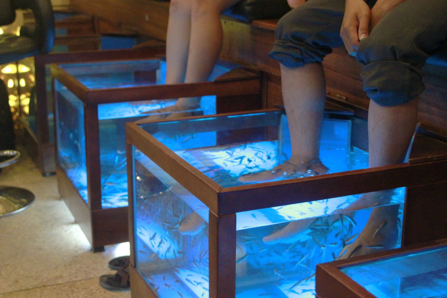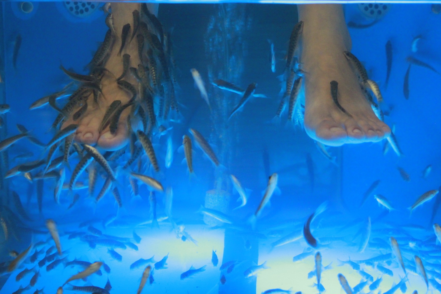 Nhân viên của quán giải thích: “Khi đặt chân vào bể, vài giây sau hàng trăm chú cá sẽ bu lại rỉa kín chân. Ban đầu sẽ có cảm giác buồn buồn như có dòng điện nhẹ chạy trong chân tay, nhưng khi quen dần thì rất dễ chịu”.