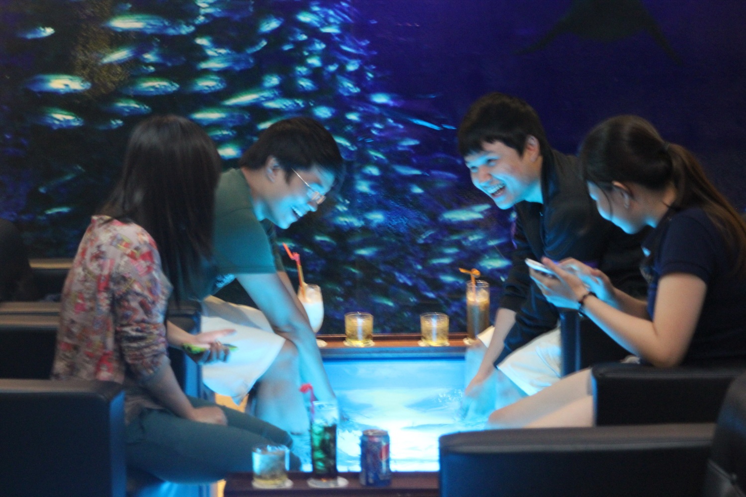 Khách vừa ngắm vừa được các chú cá massage, thưởng thức các loại đồ uống.