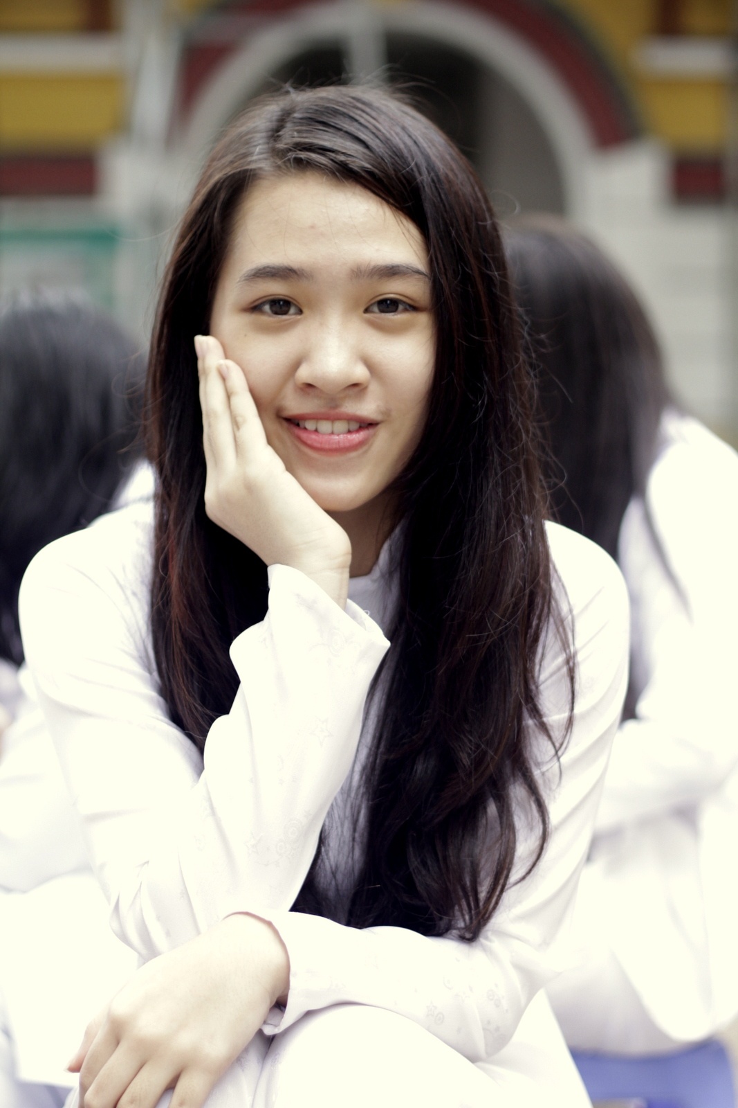| Dưới sân nữ sinh nhí nhố, tinh nghịch trong tà áo dài. |