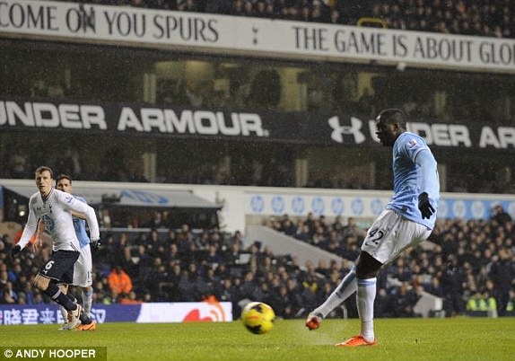 | Bàn thắng từ chấm 11m của Yaya Toure là bước ngoặt lớn trong trận Man City đánh bại Tottenham. Ảnh: Dailymail. |