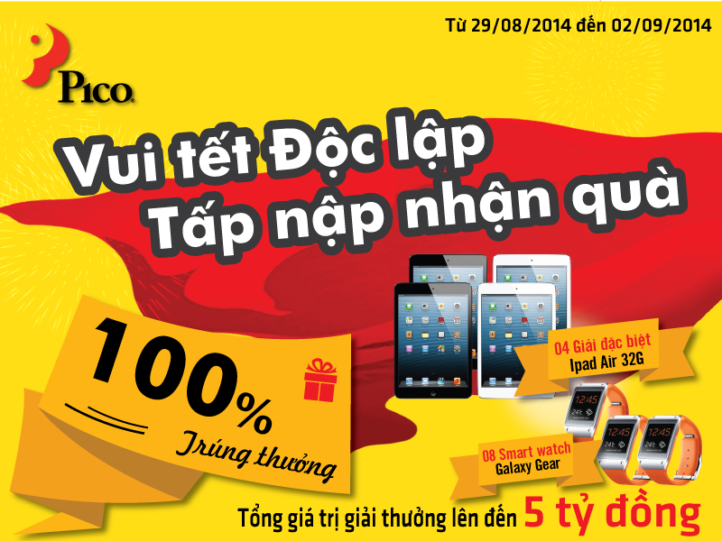 Nội dung chi tiết về chương trình khuyến mãi và kết quả trúng thưởng tại website www.pico.vn, trực tiếp tại các siêu thị Pico hoặc gọi số điện thoại 1900.6619 - 0904.881169