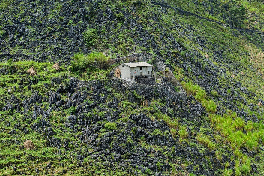 | Một ngôi nhà nằm trên sườn núi cheo leo tại khu vực giữa huyện Đồng Văn và Mèo Vạc. |