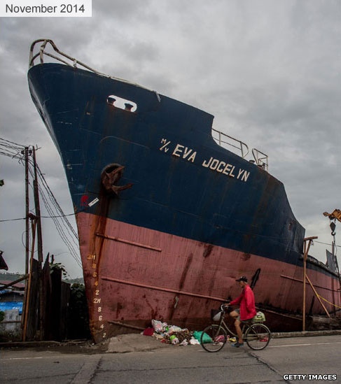 | Tuy nhiên, dấu vết của thảm họa vẫn hiện hữu ở Anibong. Con tàu lớn bị sóng biển và gió mạnh cuốn lên bờ vẫn nằm tại chỗ. Người ta chưa đủ nguồn lực để đưa nó xuống nước hay hóa kiếp xác tàu để trả lại không gian sống ban đầu. |