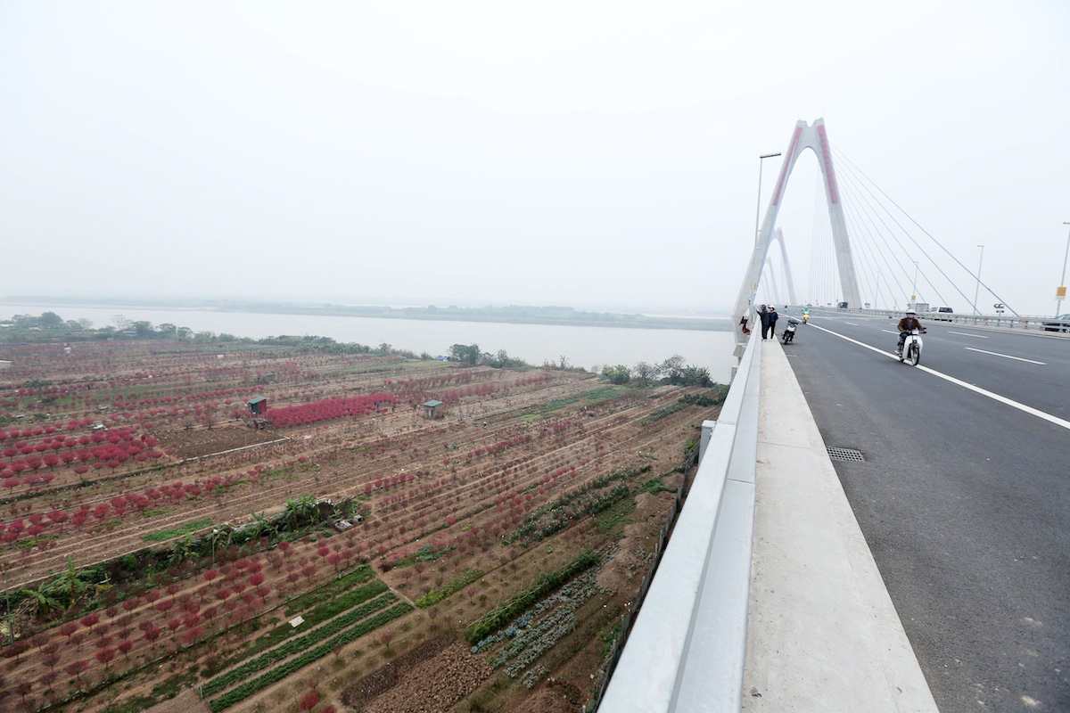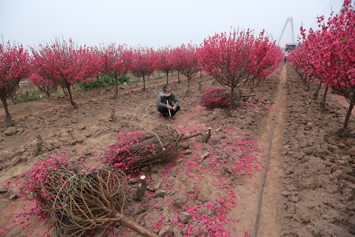 | Đào đã xuống phố, chợ và đi các tỉnh phục vụ Tết, nhưng trên cánh đồng làng Phú Thượng, Nhật Tân, dưới chân cây cầu hữu nghị Việt - Nhật vẫn còn nhiều và đang nở rộ đón xuân. |