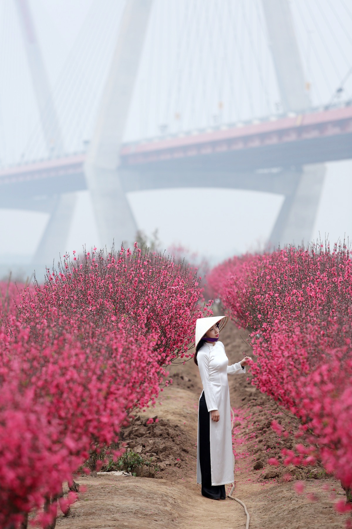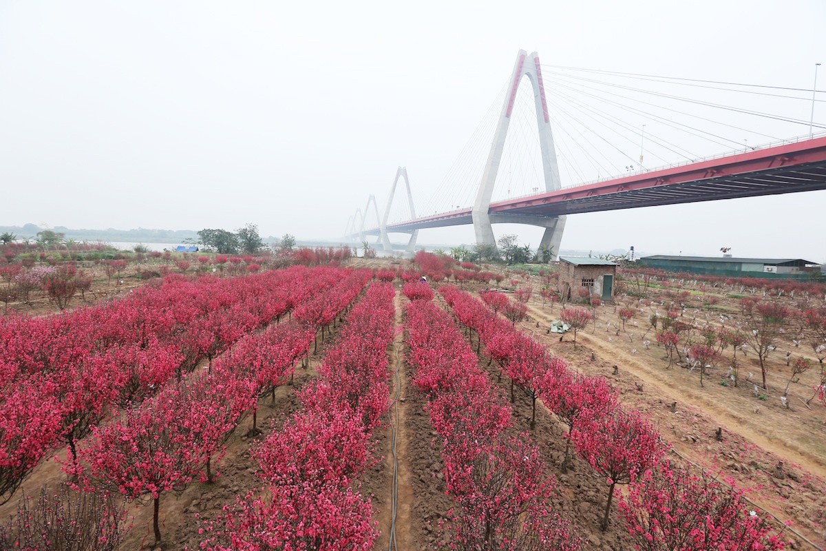 Cách thời điểm bước sang năm mới Ất Mùi 5 ngày, làng trồng đào ngay dưới chân cầu Nhật Tân (Hà Nội) trở nên rực rỡ khi hầu hết các cánh hoa đã nở bung đón xuân.
