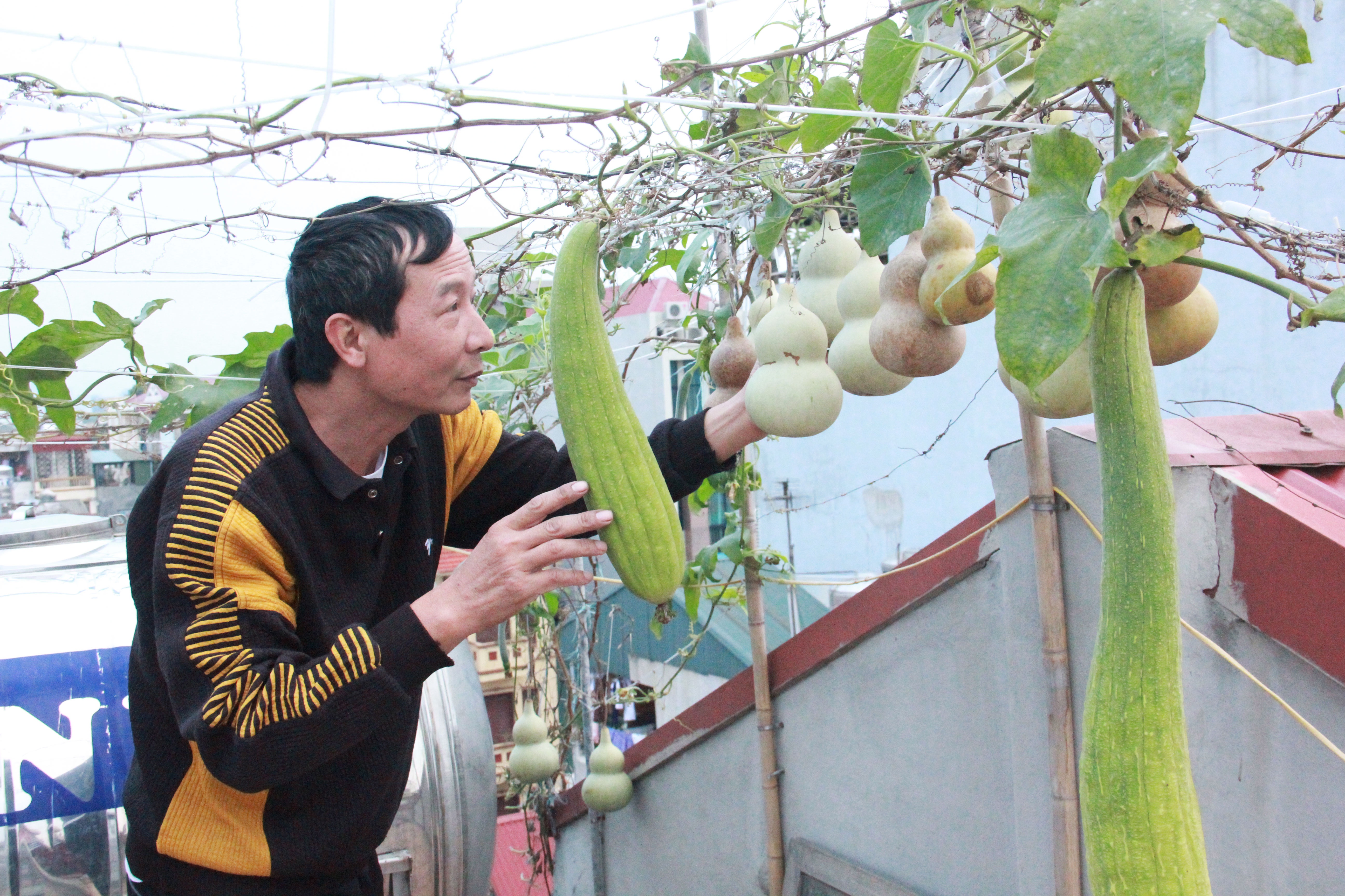 Giữa dãy phố chật chội, chen chúc, giàn bầu hồ lô trĩu quả và mướp hương xanh mướt trên sân thượng của ông Thắng là ao ước của biết bao gia đình ở Hà Nội. Ông cho biết, ngày nào cũng tiếp bạn bè, người thận, thậm chí cả những người xa lạ đến thăm vườn. |