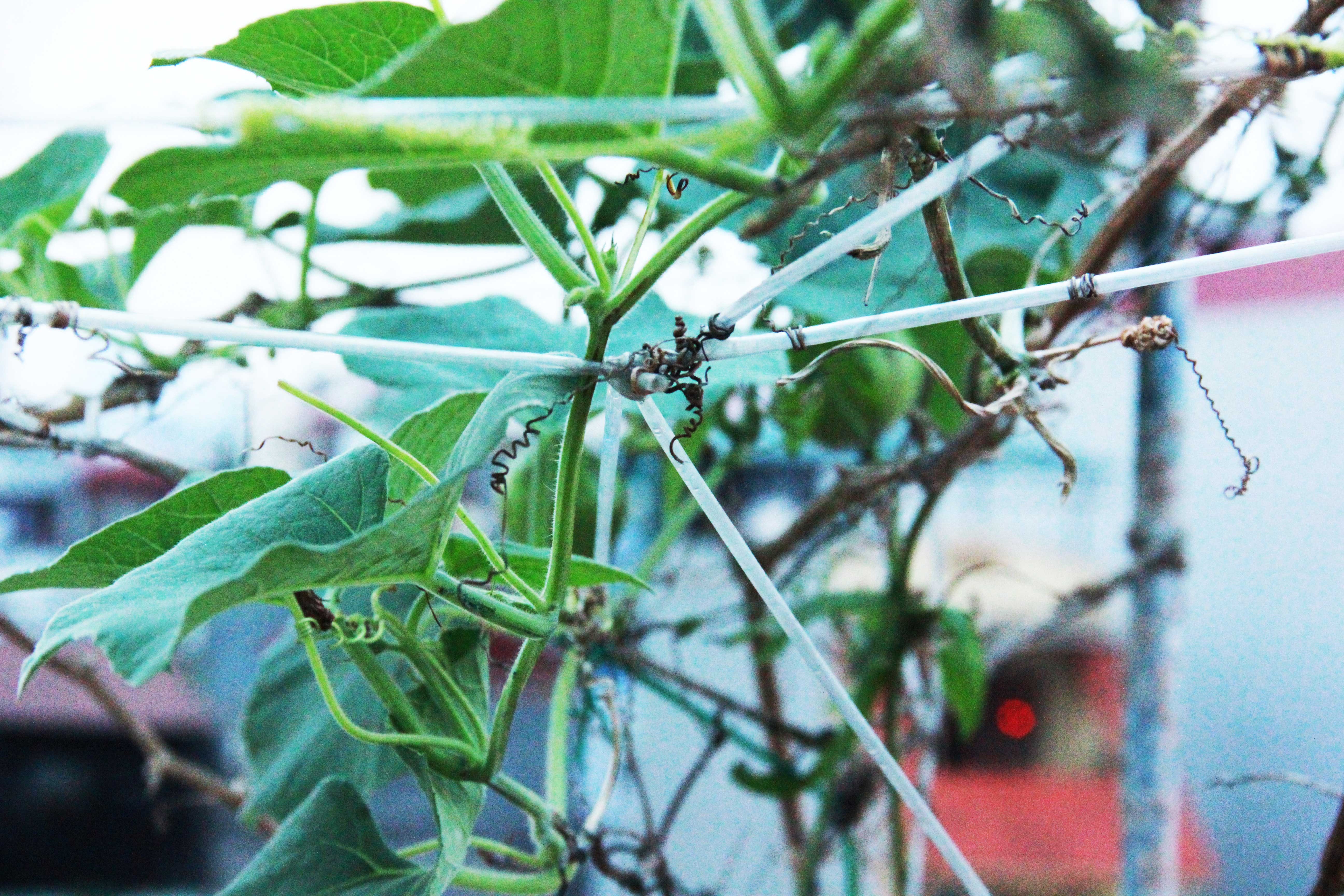 Giàn bầu, mướp hương được giăng bằng dây truyền dịch. |