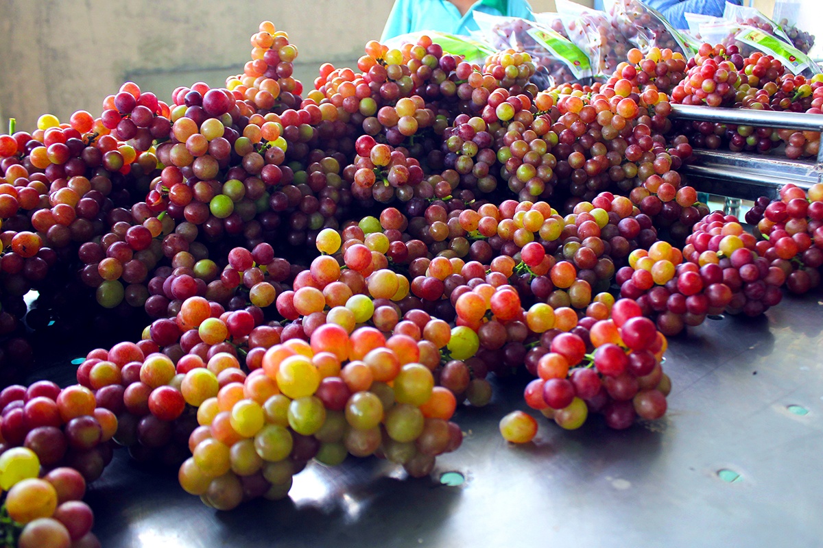 Những giỏ nho tươi vừa mới hái đang được phân loại,