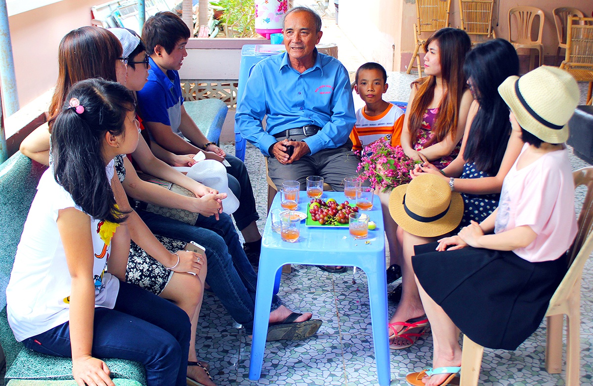Ông Ba Mọi (áo xanh) dù tất bật nhưng hằng ngày vẫn dành phần lớn thời gian đón tiếp khách tham quan, đoàn nào cũng được ông giải thích cặn kẽ về cách trồng nho và sản xuất rượu, si rô nho.