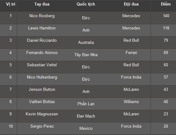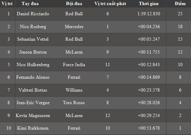 *Kết quả 10 tay đua giành điểm tại chặng Canadian GP 2014: