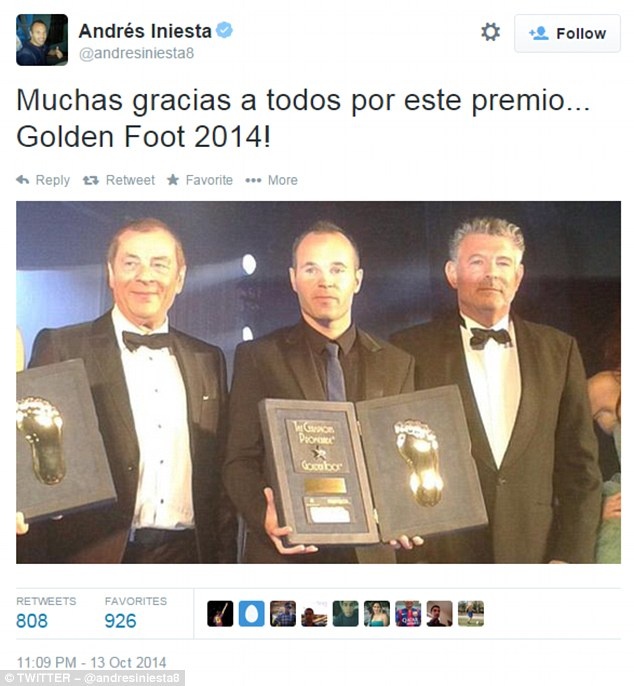 | Không lâu sau khi đoạt giải, Iniesta đăng dòng trạng thái trên twitter. "Cảm ơn tất cả mọi người vì giải thưởng... Bàn chân Vàng 2014". |