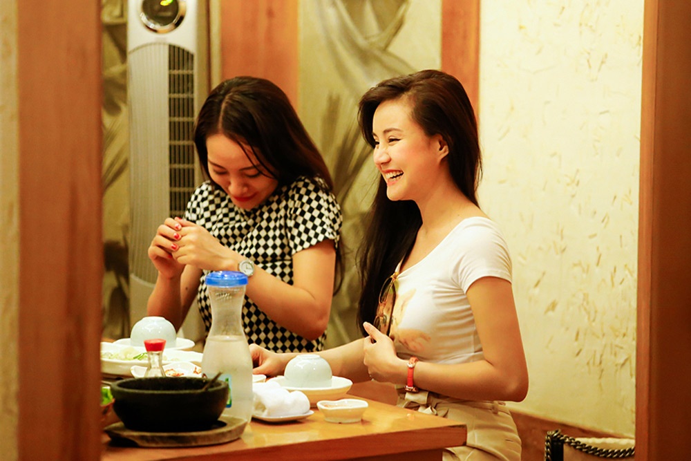 | Vy Oanh cười nói, thư giãn khi đi ăn uống cùng những người bạn. |