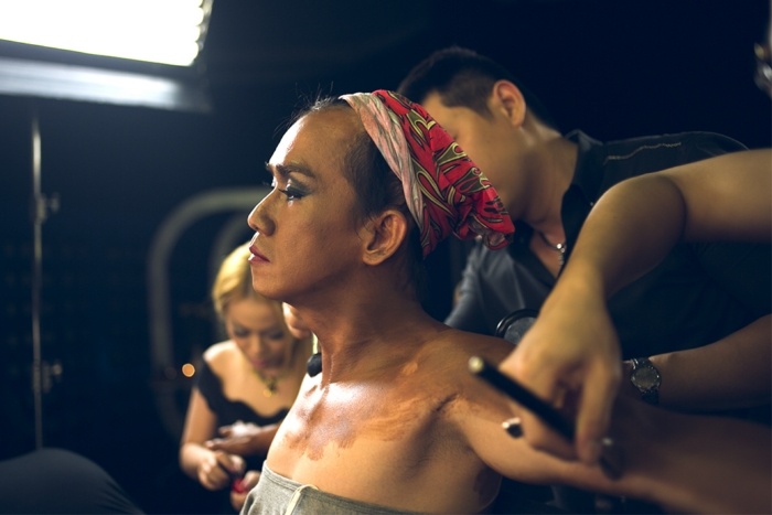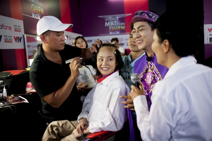 | Để hoá thân giống nhân vật, Vy Oanh phải nhờ chuyên viên trang điểm giúp mình có kiểu tóc lưa thưa giống nhạc sĩ. |