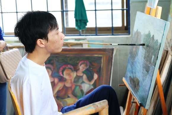 Tới thăm Nhà may mắn lần này, cô được tận mắt chứng kiến một bạn trẻ dùng miệng vẽ tranh và không giấu được sự cảm phục.