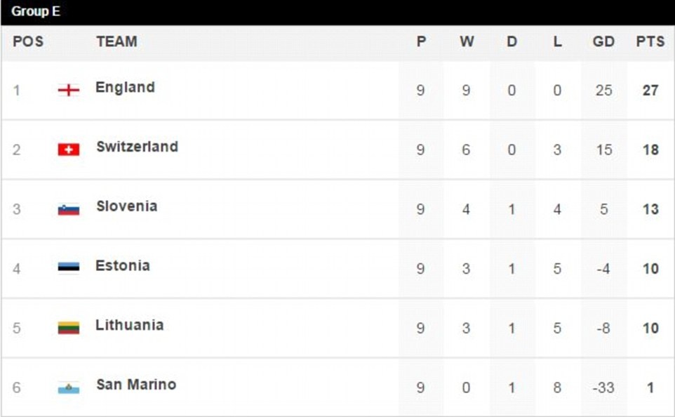 | Vị trí của các đội ở bảng E sau lượt trận thứ 9 vòng loại EURO 2016. ĐT Anh dẫn đầu với 27 điểm. |