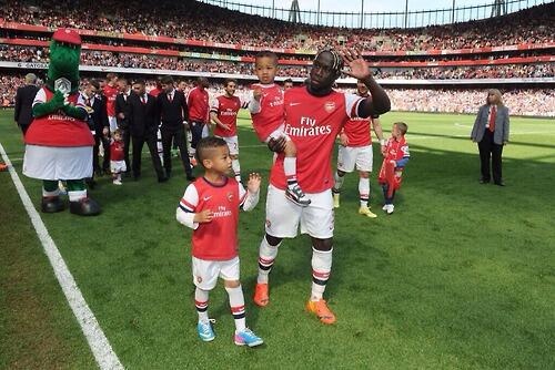 | Sagna cùng con hai con đi quanh sân chào khán giả tại Emirates. Ảnh: Hereisthecity. |