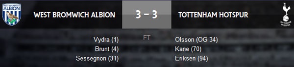 Kết thúc trận đấu, West Brom và Tottenham hòa 3-3.