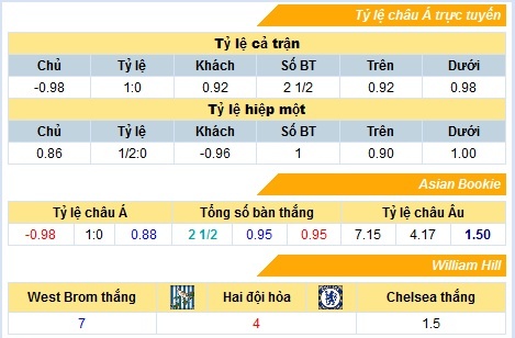 Lịch sử cho thấy đây là đối thủ không hề dễ chơi của The Blues. Trong 4 lần chạm trán gần nhất với West Brom, gã nhà giàu London chỉ có vỏn vẹn 1 chiến thắng (1 thắng, 1 hòa, 2 thua). Cả 2 thất bại của Chelsea trước West Brom đều diễn ra tại The Hawthorns, nơi mà họ phải ghé thăm ở loạt đấu sớm đêm nay.