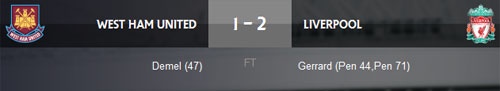 Với mục tiêu thu về 3 điểm, Liverpool nỗ lực tấn công trong hiệp 2. Thêm một lần nữa trọng tài Anthony Taylor cho Liverpool hưởng quả penalty, và Gerrard không gặp khó khăn trong việc ghi bàn ở tình huống đối mặt với thủ môn Adrian. Giành chiến thắng 2-1 trên sân của West Ham, Lữ đoàn đỏ trở lại vị trí số 1 khi nhiều hơn 2 điểm so với đội xếp thứ 2 Chelsea.