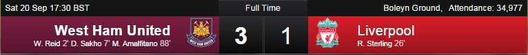 Từ một pha phá bóng bất cẩn của hậu vệ Sakho, đội chủ nhà thực hiện đường phản công nhanh sắc sảo. Ở tư thế trống trải, Amalfitano dễ dàng hạ gục Mignolet ấn định chiến thắng 3-1 cho West Ham khi kim đồng hồ chỉ sang phút 88.
