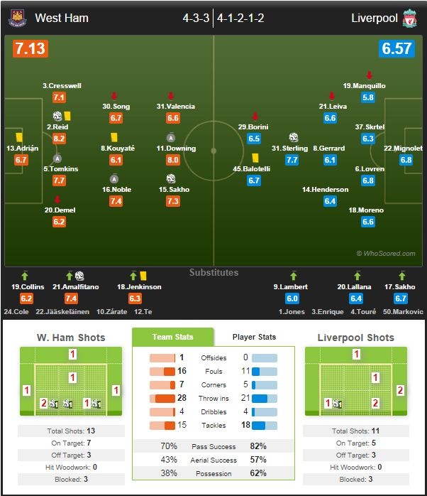 Trong vòng vỏn vẹn 5 phút, từ phút thứ 2 đến thứ 7, mành lưới của thủ thành Simon Mignolet liên tiếp phải rung lên sau những pha dứt điểm của Winston Reid và Diafra Sakho. Cả hai bàn thua đều có lỗi rất lớn từ khả năng phòng ngự vô cùng kém cỏi của đội khách.
