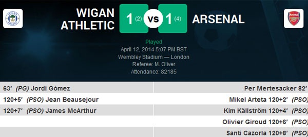 Kết thúc hiệp phụ thứ 2, Wigan và Arsenal hòa nhau với tỷ số 1-1.