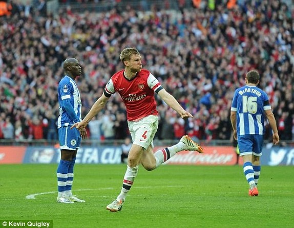 | Mertesacker ghi bàn gỡ hòa 1-1 cho Arsenal trong 90 phút thi đấu chính thức. Ảnh: Daily Mail. |