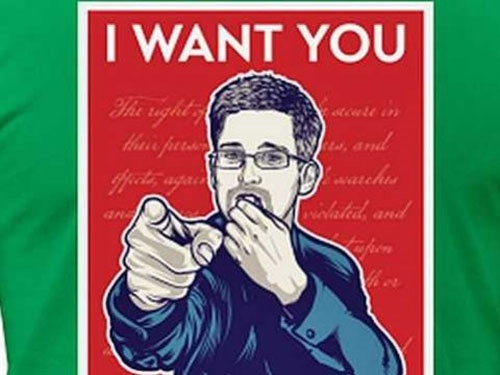 Trong mẩu rao bán áo Snowden có đoạn: Hãy giúp WikiLeaks hỗ trợ Edward Snowden, người tố cáo chương trình giám sát của Chính phủ, bằng cách mua thiết kế tuyệt vời này của LibertyManiacs.com.