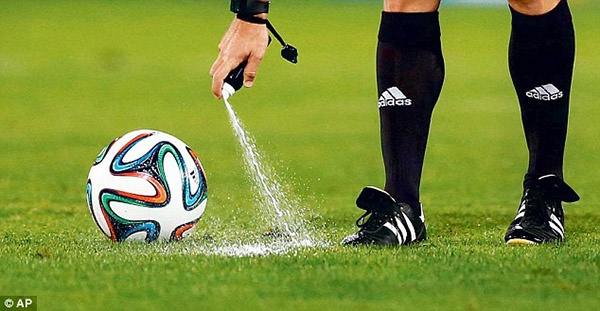 Đầu tiên phải kể đến một loại sơn xịt tự mất màu dành cho các trọng tài. Vị "vua sân cỏ" sẽ được trang bị một dây lưng đặc biệt để đeo lọ sơn thay vì đút vào túi quần soóc. Khi có cầu thủ bị phạm lỗi trên sân và trọng tài cho thực hiện một quả đá phạt, theo luật bóng đá thì hàng rào cầu thủ đối phương sẽ phải đứng cách điểm sút phạt 9 mét. Để khoảng cách này không bị "ăn gian", trọng tài xử dụng lọ sơn xịt để vạch một đường trên cỏ. Các cầu thủ đứng làm hàng rào sẽ không được phép vượt qua vạch sơn này. Trước đây khi chưa có vạch sơn thì các cầu thủ hàng rào rất hay dùng tiểu xảo nhích lên gần điểm sút phạt để cản phá. Loại sơn xịt mà trọng tài sử dụng sẽ tự mất màu sau một phút, không làm ảnh hưởng đến mỹ quan sân cỏ.
