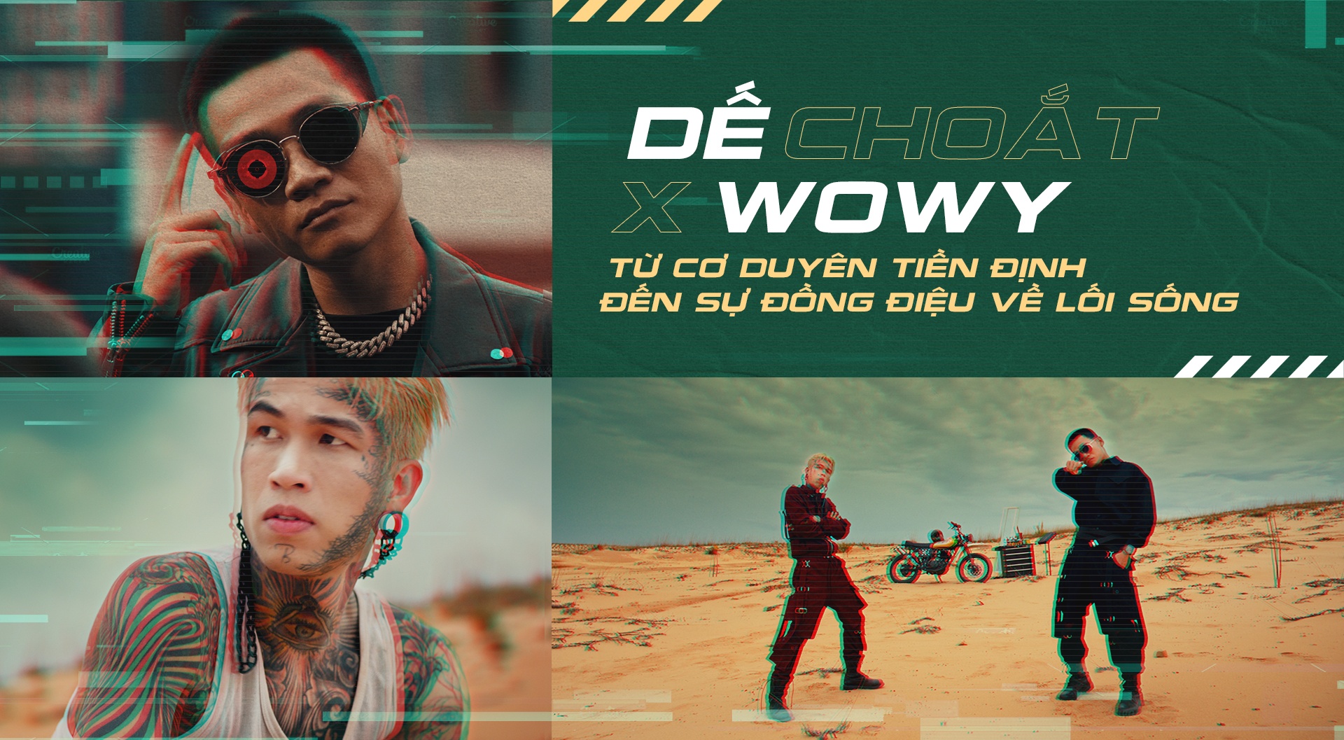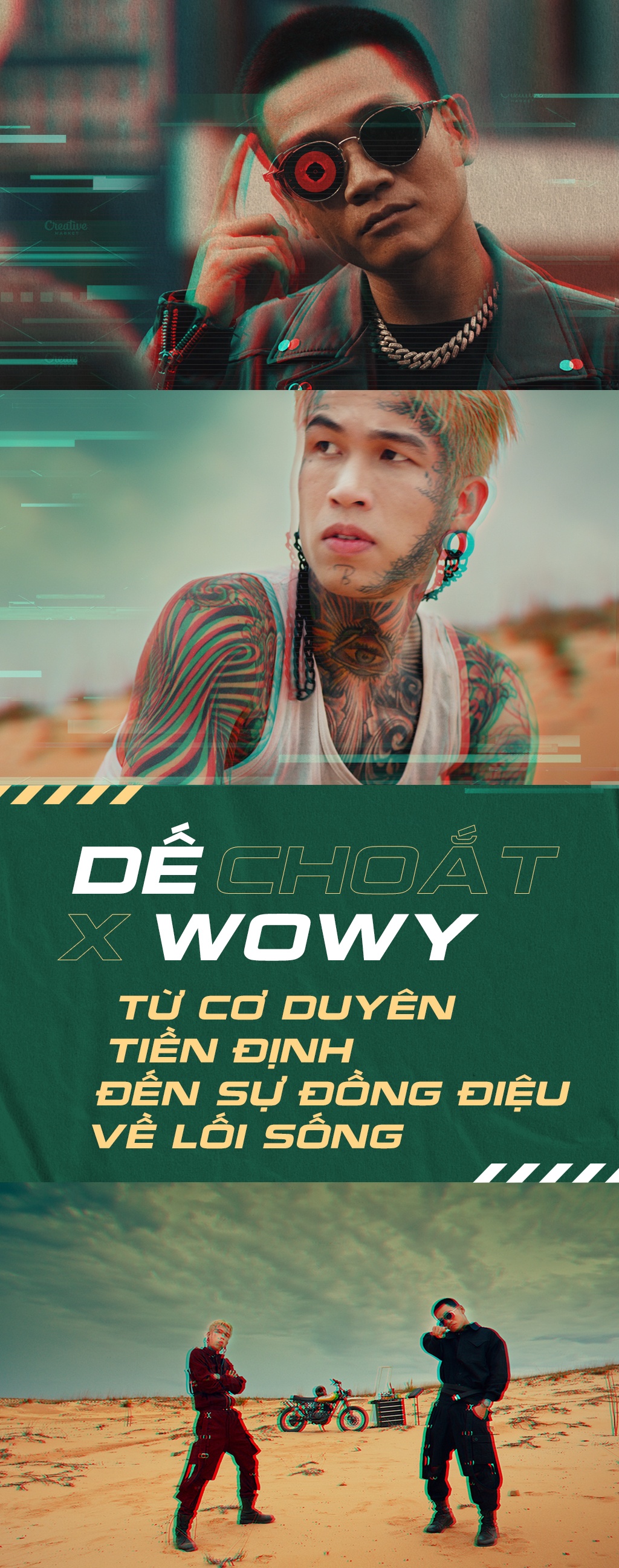 - Không phải bây giờ mà rất lâu trước đó, anh Wowy đã trở thành nguồn cảm hứng sáng tác cũng như hình mẫu của Dế. Có thể nói, xuất phát điểm của tôi khá giống anh, nên tìm thấy sự đồng điệu ngay từ đầu, thậm chí tôi xăm một câu tâm đắc trong bài rao của anh lên lưng.