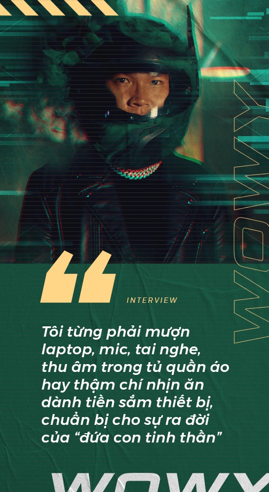 - Không con đường nào trải đầy hoa hồng, nhất là với người có xuất phát điểm thấp như Wowy. Tôi lớn lên ở khu ổ chuột, làm bạn với những đứa trẻ đường phố và đến với rap từ hai bàn tay trắng. Đứa trẻ nghèo ngày ấy thoả đam mê bằng cách mượn - mượn laptop, mic, tai nghe, thu âm trong tủ quần áo hay thậm chí nhịn ăn dành tiền sắm thiết bị, chuẩn bị cho sự ra đời của “đứa con tinh thần”.