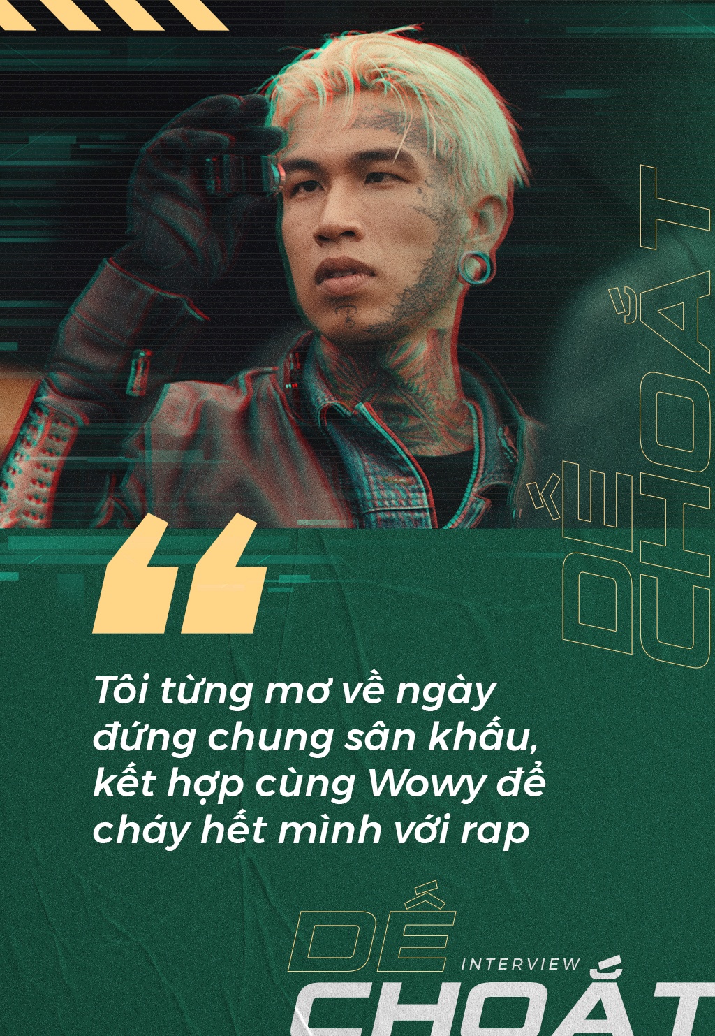 Tôi từng mơ về ngày đứng chung sân khấu, kết hợp cùng thần tượng để cháy hết mình với rap. Đó cũng là lý do tôi không ngần ngại chọn về đội Wowy trong Rap Việt. Quyết định này đã đưa tôi qua nhiều cung bậc cảm xúc và trải nghiệm, nghĩ lại vẫn biết ơn vô cùng. Khán giả biết đến Dế không còn chỉ vì hình xăm quái lạ, mà bởi khả năng âm nhạc thực thụ.