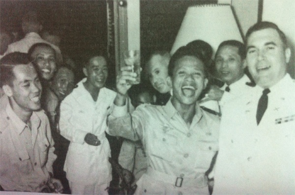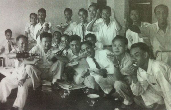 | Phạm Xuân Ẩn (hàng duwois, bìa phải) rất thích tấm hình chụp buổi tiệc đầu tiên của ông tại Caltex Oil. (Hình ảnh đăng tải trong cuốn sách). |
