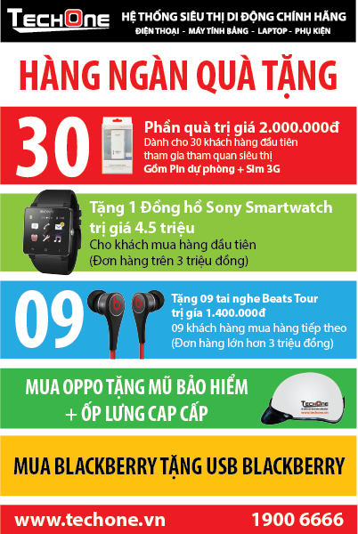 Khách hàng đến mua sắm sản phẩm bất kỳ trên toàn hệ thống TechOne sẽ được nhận phiếu bốc thăm cơ hội trúng xe máy SH, iPhone 6, OPPO Find 7A, OPPO Neo 3 cùng hàng nghìn giải thưởng hấp dẫn khác.Tổng giá trị quà tặng lên tới một tỷ đồng.