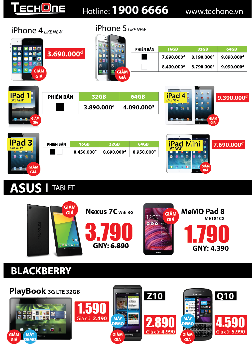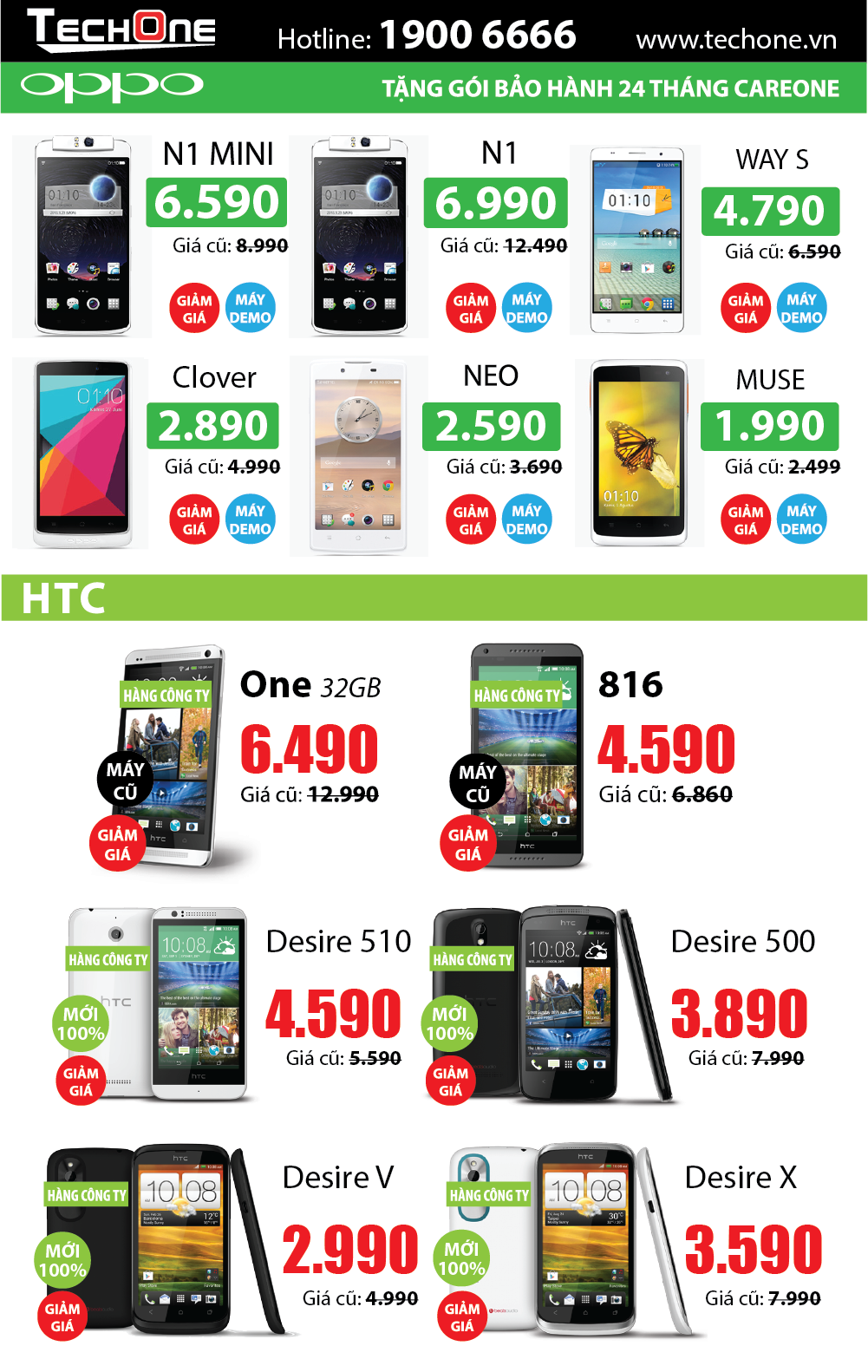 Thị trường công nghệ nửa cuối năm đang cực kỳ sôi động với sự ra mắt của hàng loạt sản phẩm mới từ các hãng tên tuổi: Nokia Lumia 930, Nokia Lumia 530,OPPO Find 7 2K, iPhone 6, Samsung Note 4 và Samsung Alpha… Để tri ân và tạo cơ hội cho khách hàng sở hữu những sản phẩm công nghệ cao cấp, nhưng chưa đủ điều kiện, TechOne xả kho hàng trưng bày (hàng demo) với giá giảm tới 5 triệu đồng. Khách hàng có thể dễ dàng mua một chiếc máy mới 99% với giá rẻ hơn tới 5 triệu đồng.