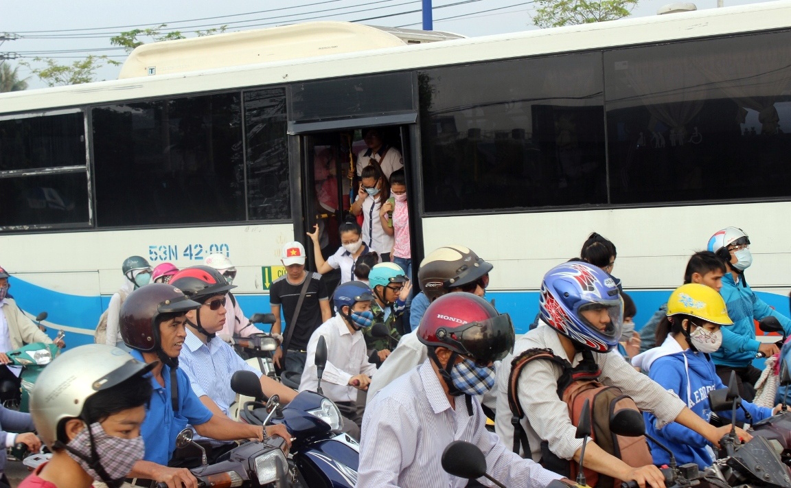 | Nhiều xe buýt không thể vào trạm nên phải để khách xuống giữa đường. |