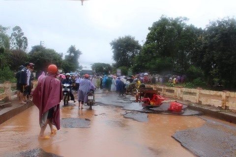 | Nước lũ cũng làm ngập sâu và hư hỏng nặng cầu Eakal khiến giao thông trên Quốc lộ 14 bị ách tắc nhiều giờ liền. Lực lượng chức năng đã kịp thời có mặt phong tỏa khu vực cầu, nhưng nhiều người dân hiếu kỳ vẫn tập trung rất đông tại khu vực nguy hiểm. |