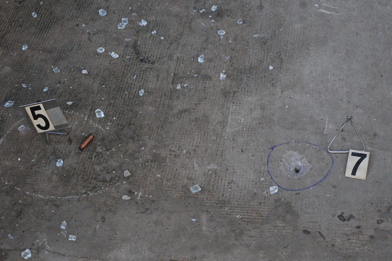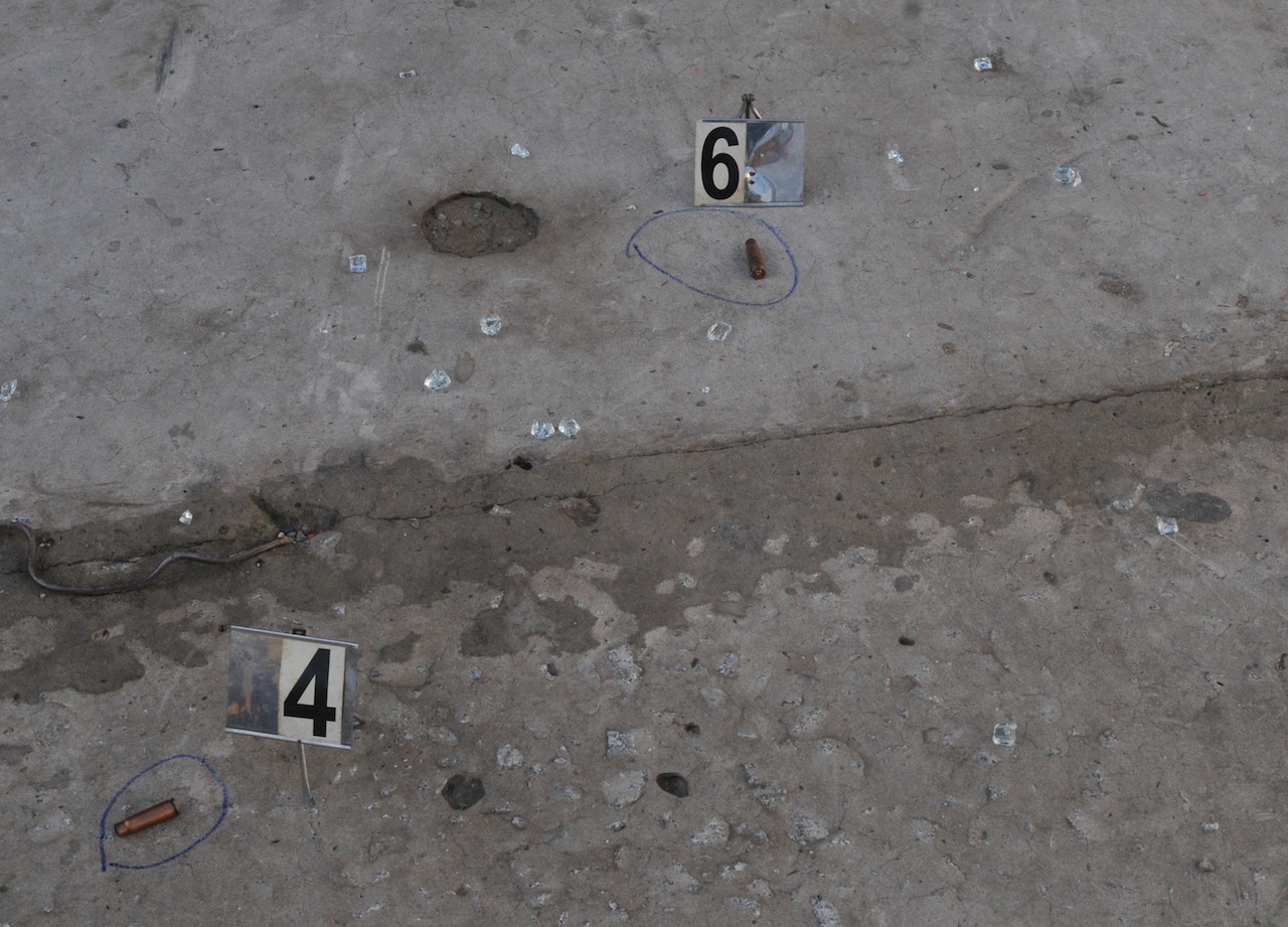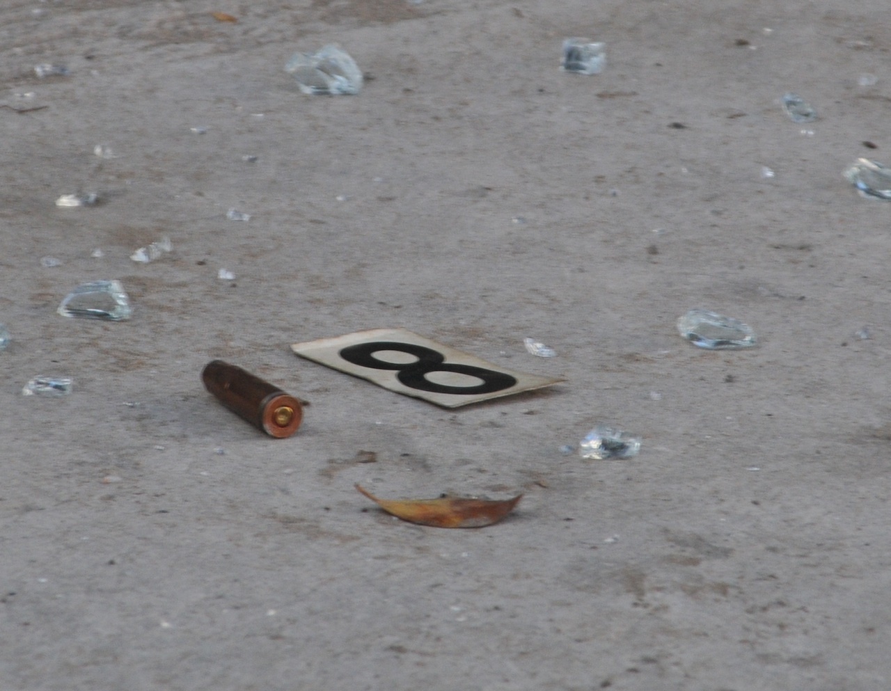 Trong lúc lực lượng kêu gọi thanh niên ra đầu thú, các cảnh sát hình sự đặc nhiệm được trang bị vũ trang đã bí mật tiếp cận hiện trường. Trong ảnh: Hoàng loạt vỏ đạn tại hiện trường.