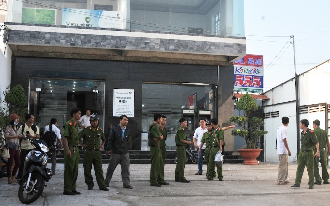 Nhà nghỉ nơi xảy ra sự việc đồng thời cũng là trụ sở phòng giao dịch của một ngân hàng. Công an Cần Thơ đang tổ chức họp báo để thông báo về vụ việc. Trong ảnh: Lực lượng công an phong toả hiện trường và điều tiết giao thông không để xảy ra tình trạng ùn tắc.