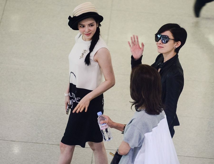 Lý Nhã Kỳ ăn vận giản dị với váy suông, tóc tết đơn giản trực tiếp ra sân bay đón người đẹp TVB đến Việt Nam. Trong khi đó, nữ diễn viên Cung tâm kế diện "cây đen" cá tính, cô vẫy tay chào khán giả Việt.