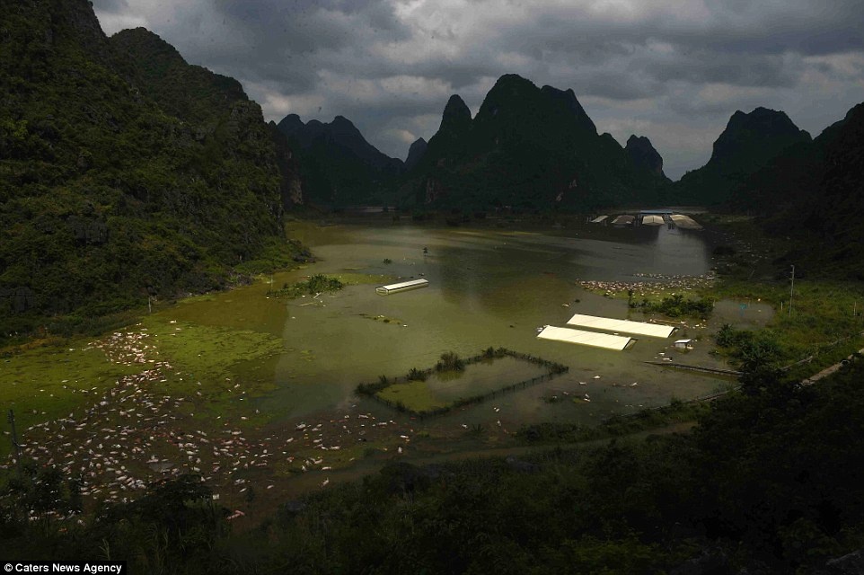 Các trang trại nuôi lợn nằm giữa thung lũng được bao quanh bởi các vách núi dựng đứng. Địa hình này khiến chúng chịu thiệt hại nặng nề nhất khi nước đổ về. Ảnh: CNA |