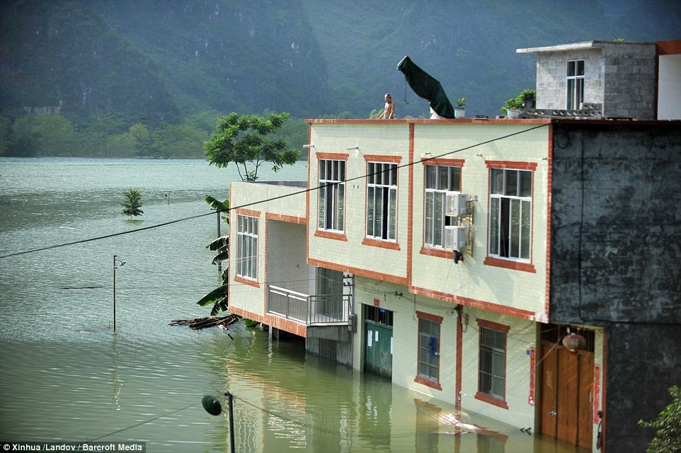 Nhà chức trách Trung Quốc cho biết, mưa lớn kéo dài nhiều ngày ở Quảng Tây. Vào lúc đỉnh điểm, lượng mưa đạt tới 400 mm trong 20 giờ, gây ra lũ quét ở nhiều khu vực. Tại các vùng trũng, nước làm ngập mái nhiều công trình. Ảnh: CNA |