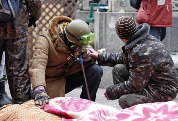 Người biểu tình cáng một người bị thương nặng tại quảng trường Độc lập. Tổng thống Ukraina Viktor Yanukovych gặp lãnh đạo phe đối lập hôm 19/2 và đạt được một thỏa thuận ngừng bắn tạm thời nhằm để tang những nạn nhân của cuộc bạo động lớn. Tuy nhiên, thỏa thuận đình chiến sụp đổ hôm 20/2 khi những phát súng nổ ra tại quảng trường Độc lập, trung tâm của các cuộc biểu tình chống chính phủ.