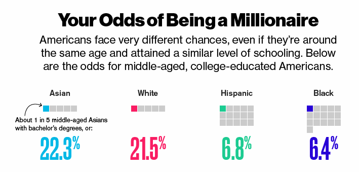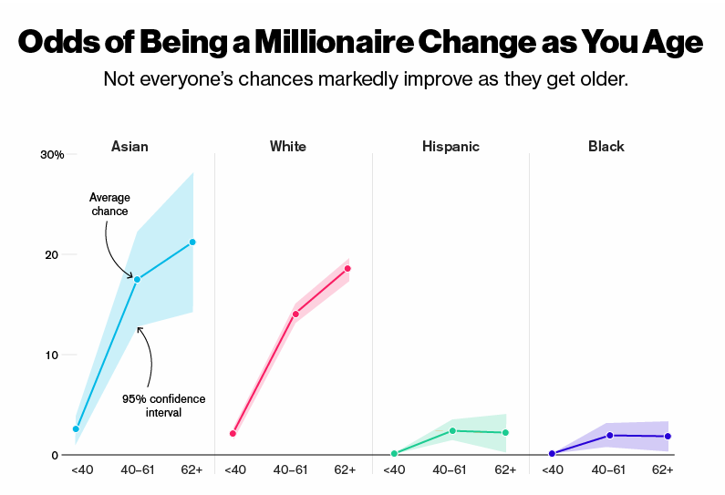 Thậm chí thời gian cũng ủng hộ cho người châu Á và người da trắng hơn những nhóm chủng tộc và sắc tộc khác. Một người châu Á trước 40 tuổi sở hữu 2,4% cơ hội trở thành triệu phú. Con số này lên đến 21% khi người đó đến tuổi về hưu. Đối với người Tây Ban Nha, xác suất này gần như không nhúc nhích, từ dưới 1% khi họ còn trẻ đến 2,3% khi họ trên 62 tuổi.